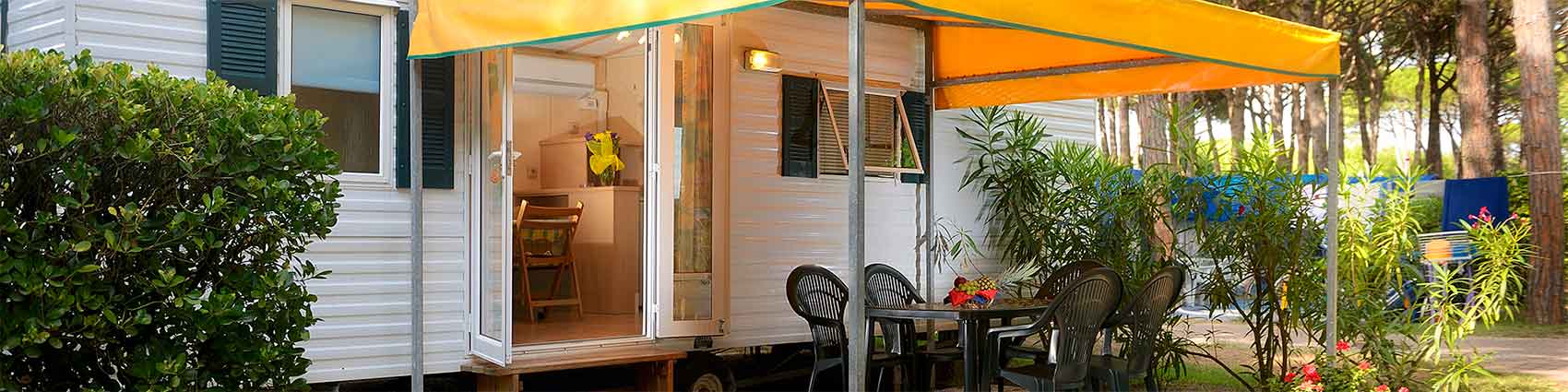 Maxi Caravan (casa mobile) composta da una camera con letto matrimoniale, una camera con due letti singoli, un divano letto per la 5° persona nell'area soggiorno, angolo cottura e frigorifero senza congelatore, un bagno con wc e un bagno con lavandino e box doccia.