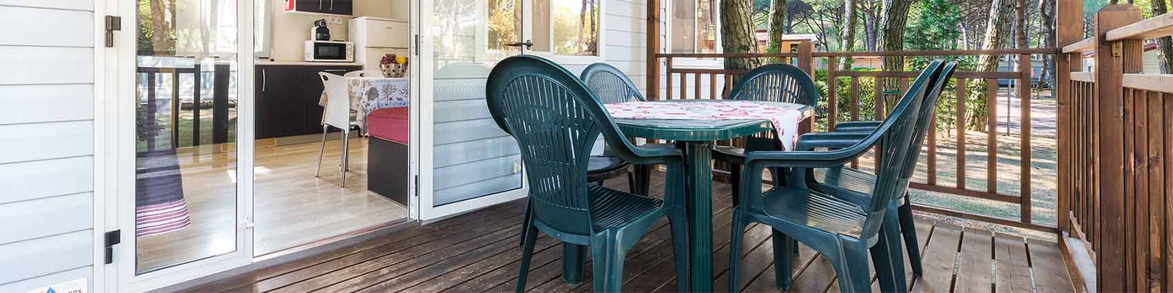 Spazioso maxi caravan con terrazza abitabile e attrezzata con tavolo e sedie con affaccio alla cucina.